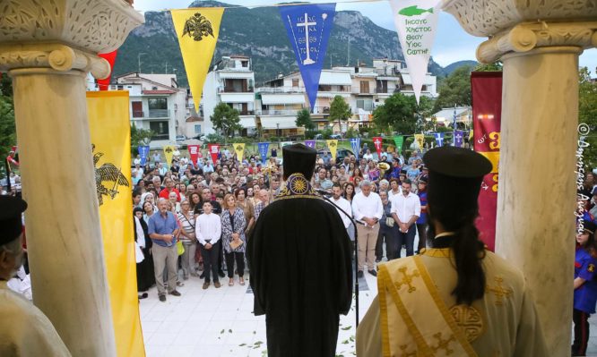 Αυτή την ευχή την προσφέρω, την χαρίζω μέσα από την καρδιά μου σε όλους ανεξαιρέτως, αφού σας ευχαριστήσω θερμά για τη σημερινή μεγαλειώδη, πνευματική σας παρουσία και εν πλω και εν οδώ και εύχομαι κάθε καλό στη ζωή σας, στις οικογένειες σας αλλά και με πολλή αγάπη θέλω να καλωσορίσω για μία ακόμη φορά όλους τους επισκέπτες της πόλεως του Αγίου Κωνσταντίνου, της πανέμορφης Λοκρίδος, της ειδυλλιακής και μοναδικής Φθιώτιδος, αυτούς που έχουν κατακλύσει τα χωριά μας στα βουνά κι αυτούς που έχουν γεμίσει και τις παραλίες μας, το παράλιο και παράκτιο μέτωπο της Μητροπόλεως μας. Όλους σας χαιρετούμε με πολλή αγάπη, σας καλωσορίζουμε και τους εγγύς και τους μακράν και ευχόμεθα να συνδεθείτε με αυτό τον τόπο περισσότερο από ότι είναι συνδεδεμένοι οι γηγενείς και οι ντόπιοι, να πολιτογραφηθείτε με την καρδιά σας και να γίνετε ένα με τη Φθιώτιδα και με τον πολιτισμό που αυτήν κομίζει και το ήθος το οποίο προσφέρει».