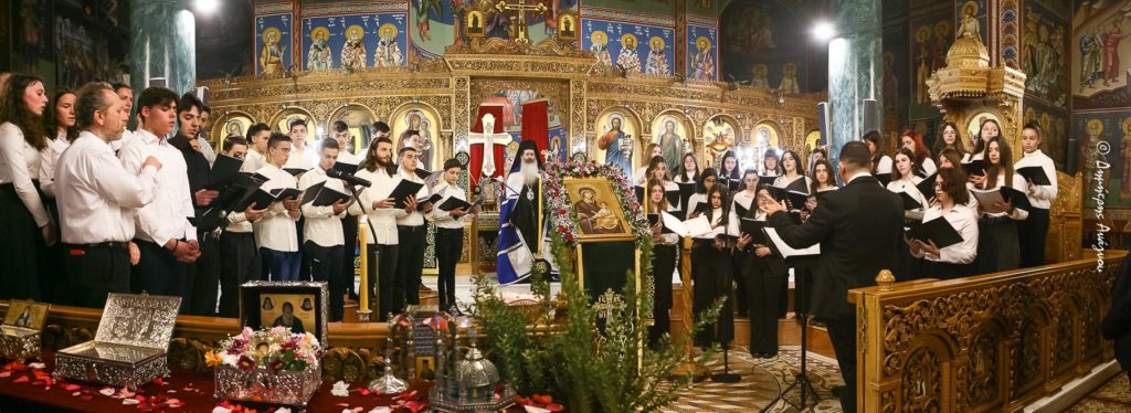 Ήλθατε απόψε, αγαπημένα μου παιδιά, να ψάλλετε στην Παναγία Μητέρα όλων μας, να ψάλλετε ύμνο και προσευχή για αυτές τις μάνες, όχι μόνο τώρα στη τελευταία τραγωδία, για αυτές τις μάνες τις χαροκαμένες, για αυτές τις μανούλες τις πονεμένες, για αυτές τις μάνες όλων μας που δακρύζουν και πονούν για μας, που υποφέρουν για όλους εμάς, ήρθατε εδώ να ψάλλετε και να προσφέρετε προσευχή και να την χαρίσετε στη μνήμη νέων ανθρώπων που έφυγαν άδικα, μάταια, γρήγορα, ανεξήγητα, ακατανόητα από αυτό τον κόσμο. Ήρθατε εδώ εσείς οι άγγελοι για να ενωθείτε με τον κόσμο των αγγέλων, ήρθατε εσείς αγαπημένα μας παιδιά για να συνομιλήσετε με τους Αγίους μας, γιατί εσείς είστε πολύ πιο κοντά στους Αγίους μας από ό,τι εμείς, εσείς είστε πολύ πιο κοντά στον Όσιο Βησσαρίωνα τον Αγαθωνίτη, αυτόν το παππούλη που αγαπούσε τα παιδιά, είστε πολύ πιο κοντά στον Όσιο Δαυίδ τον εν Ευβοία, είστε πολύ κοντά στον Όσιο Σεραφείμ από το Ζέλι, είστε πολύ κοντά στον Άγιο Ηρωδίωνα, τον πρώτο Επίσκοπο της τοπικής μας Εκκλησίας, είστε πολύ πιο κοντά στον Άγιο Νεκτάριο, ο οποίος σε δύσκολα χρόνια διωγμού και δοκιμασίας βρέθηκε στη Λαμία μας και μιλούσε στα παιδιά του τότε Γυμνασίου για αξίες και νοήματα κι έδινε κουράγιο και δύναμη σε ένα κόσμο που αναζητούσε τα πατήματά του. Εσείς είστε πολύ πιο κοντά σ όλες αυτές τις άγιες προσωπικότητες που εορτάζουν αυτές τις ημέρες.