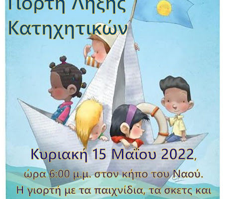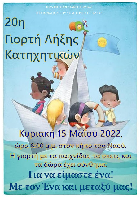 Την Κυριακή 15 Μαΐου 2022, και ώρα 6:00 μ.μ. στον κήπο του Ναού του Αγίυο Δημητρίου Ταμπουρίων, θα πραγματοποιηθεί η γιορτή Λήξης των Κατηχητικών Σχολείων της ενορίας.