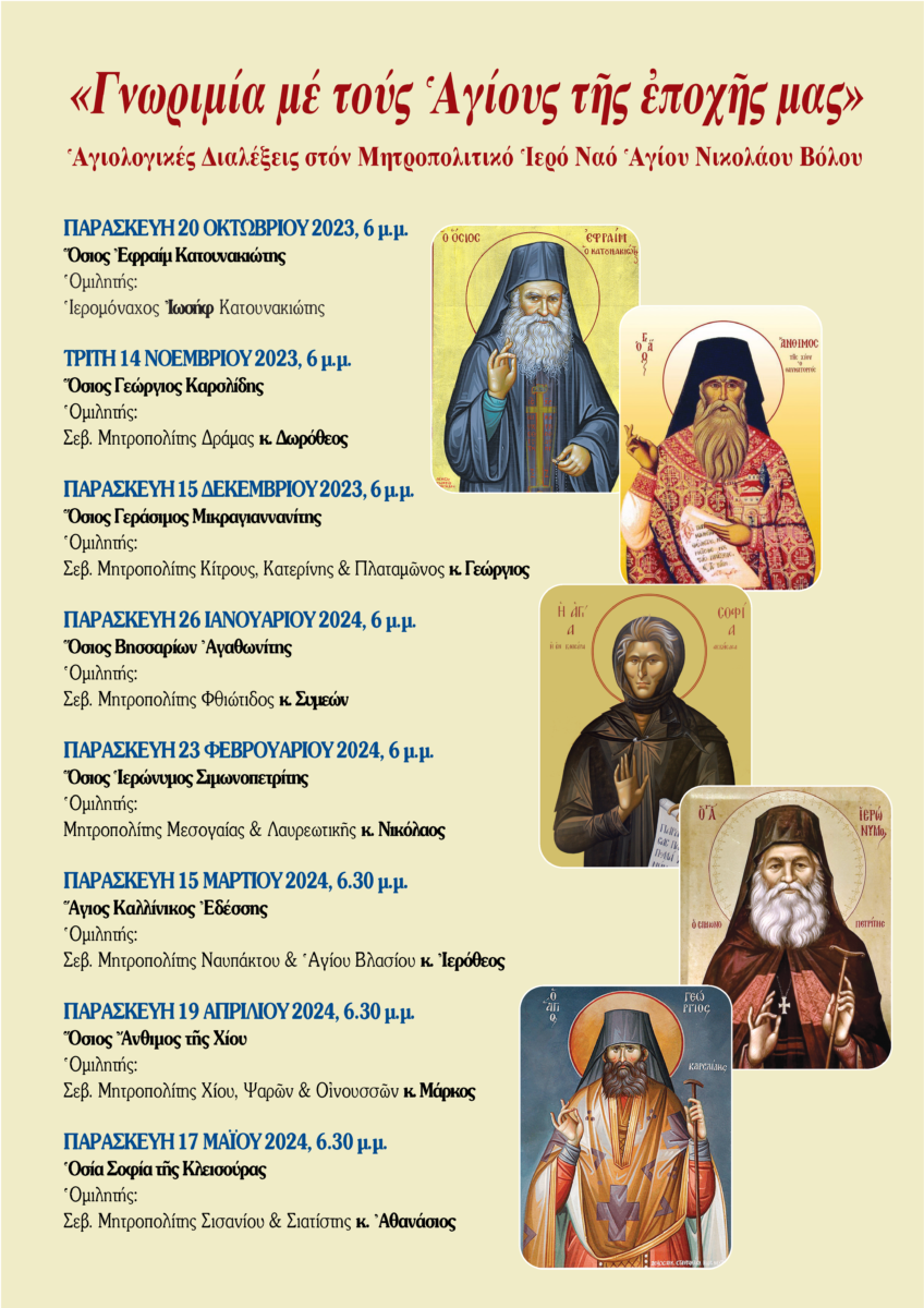 Με τη ευλογία του Σεβ. Μητροπολίτου Δημητριάδος κ. Ιγνατίου, ο Μητροπολιτικός Ιερός Ναός Αγίου Νικολάου Βόλου, διοργανώνει, για το νέο εκκλησιαστικό έτος, σειρά Αγιολογικών διαλέξεων, αφιερωμένων στους νεοφανείς Αγίους της εποχής μας. Εκλεκτοί ομιλητές, από διάφορα μέλη της Ελλάδος, θα παρουσιάσουν στο πλήρωμα της Τοπικής μας Εκκλησίας, πρόσωπα αγιασμένα του καιρού μας, με τα οποία, οι περισσότεροι εξ αυτών είχαν συνυπάρξει και μαθήτευσαν κοντά τους. Σκοπός των διαλέξεων αυτών είναι να αντλήσουμε διδάγματα ζωής από Αγίους που έζησαν στα χρόνια μας, αντιστάθηκαν στο εκκοσμικευμένο πνεύμα της εποχής μας και απέδειξαν ότι η Αγιότητα δεν είναι μια ξεπερασμένη υπόθεση του χθες, αλλά η διαχρονική εμπειρία της Εκκλησίας και η σταθερή προοπτική των όλων μας.