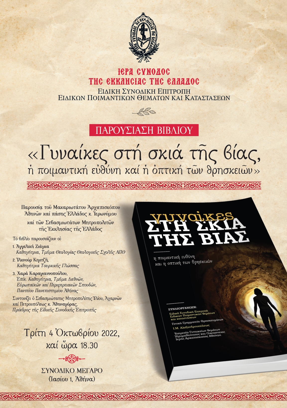 H παρουσίαση του τόμου «Γυναίκες στη σκιά της βίας, η ποιμαντική ευθύνη και η οπτική των θρησκειών», θα πραγματοποιηθεί την Τρίτη 4 Οκτωβρίου 2022 και ώρα 18.30, στο Μεγάλο Συνοδικό της Ιεράς Συνόδου της Εκκλησίας της Ελλάδος (Ιασίου 1, Αθήνα), με την σεπτή παρουσία του Μακαριωτάτου Αρχιεπισκόπου Αθηνών και πάσης Ελλάδος κ. Ιερωνύμου και των Σεβασμιωτάτων Μητροπολιτών της Εκκλησίας της Ελλάδος.
