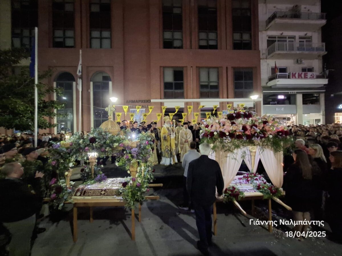 Έπειτα, πραγματοποιήθηκε η περιφορά του Επιταφίου στους δρόμους της πόλεως, όπου και φέτος μπροστά στο Δημαρχείο έγινε η συνάντηση τον Επιταφιών του Μητροπολιτικού Ναού με του Αγίου Ελευθερίου. Εκεί, τελέστηκε δέηση και στη συνέχεια ο Ποιμενάρχης μας απηύθυνε επίκαιρες ευχές προς τους πιστούς των δύο ενοριών.