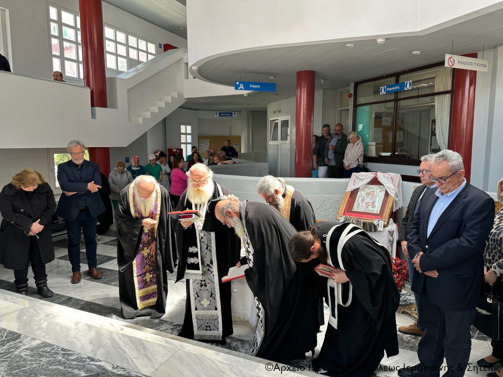 Μετά το πέρας του Ιερού Μυστηρίου, που τελέσθηκε στο χώρο όπου βρίσκεται το προσκυνητάρι στην είσοδο του νοσοκομείου, ο Σεβασμιώτατος με τους ιερείς έχρισαν με το Άγιο Έλαιο όλους τους παρισταμένους και ευχήθηκε ολόψυχα στο ιατρικό, νοσηλευτικό, διοικητικό και βοηθητικό προσωπικό του Νοσοκομείου και στους νοσηλευόμενους καλή Ανάσταση, καθώς και στον νέο διοικητή του νοσοκομείου κ. Ν. Σολιδάκη πλήρη επιτυχία στο έργο του. Στη συνέχεια οι Κληρικοί που έλαβαν μέρος στο Ιερό Μυστήριο διήλθαν από τους θαλάμους νοσηλείας και τους λοιπούς χώρους του νοσοκομείου, και έχρισαν με το Άγιο Έλαιο όλους τους ασθενείς.