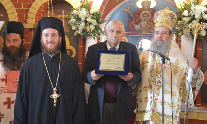 Προ της Απολύσεως, με πρόταση του Προϊσταμένου του Ιερού Ναού, ο Σεβασμιώτατος τίμησε με ειδική πλακέτα τον Εξαίρετο Παιδαγωγό, Σχολικό Σύμβουλο, Ιεροψάλτη και Εκκλησιαστικό Σύμβουλο κ. Δημήτριο Καραμανώλη, εκλεκτό συνεργάτη του π. Θεοκλήτου, λίαν αγαπητό πρόσωπο διαχρονικά στην Τοπική Κοινωνία και στήριγμα του Επισκόπου μας.