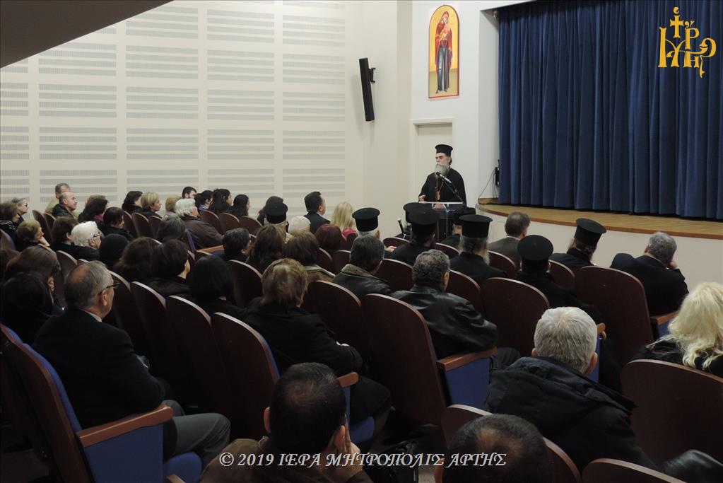 Την Τετάρτη 30 Ιανουαρίου 2019, το απόγευμα, στο Πνευματικό Κέντρο της Ιεράς Μητροπόλεως Άρτης «Άγιος Ιωάννης ο Θεολόγος», πραγματοποιήθηκε, επί τη μνήμη των Τριών Ιεραρχών, εκδήλωση, προς τιμήν των Εκπαιδευτικών της Άρτας, με ομιλητή τον Πανοσιολογιώτατο Αρχιμανδρίτη Γέροντα Βασίλειο Γοντικάκη, Προηγούμενον της Ιεράς Μονής Ιβήρων του Αγίου Όρους.