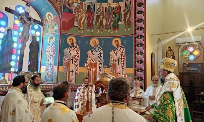 Σήμερα τό πρωί, Δευτέρα τοῦ Ἁγίου Πνεύματος, ὁμοίως ὁ Σεβ. Μητροπολίτης μας χοροστάτησε στόν Ὄρθρο, τέλεσε τήν Θεία Λειτουργία καί εὐηγγελίσθη τόν θεῖο λόγο στούς πιστούς, ἔχοντας συλλειτουργούς του τόν Γεν. Ἀρχιερατικό Ἐπίτροπο Πρωτοπρ. Στέφανο Μακρῆ, τούς Οἰκονόμους π. Ἐλευθέριο Ὀθίτη καί π. Χρῆστο Σταθόπουλο, τόν π. Ἀντώνιο Μανιᾶ, τόν π. Παντελ. Μακρόπουλο, τόν π. Φιλόθεο Κάλφα, τόν π. Γεώργιο Κακακιό, τόν Ἐφημέριο τοῦ ἑορτάζοντος Ἱ. Ναοῦ Ἁγίας Τριάδος π. Γεώργιο Χατζηχρυσάφη καί τόν Ἱεροδιάκονο π. Παῦλο Τερεζάκη. Ἐν συνεχείᾳ πραγματοποιήθηκε ἡ καθιερωμένη λιτανεία τῆς ἐφεστίου ἱ. Εἰκόνος τῆς Ἁγίας Τριάδος πέριξ τοῦ Ἱ. Ναοῦ πρός εὐλογία τῶν συμμετεχόντων πιστῶν.