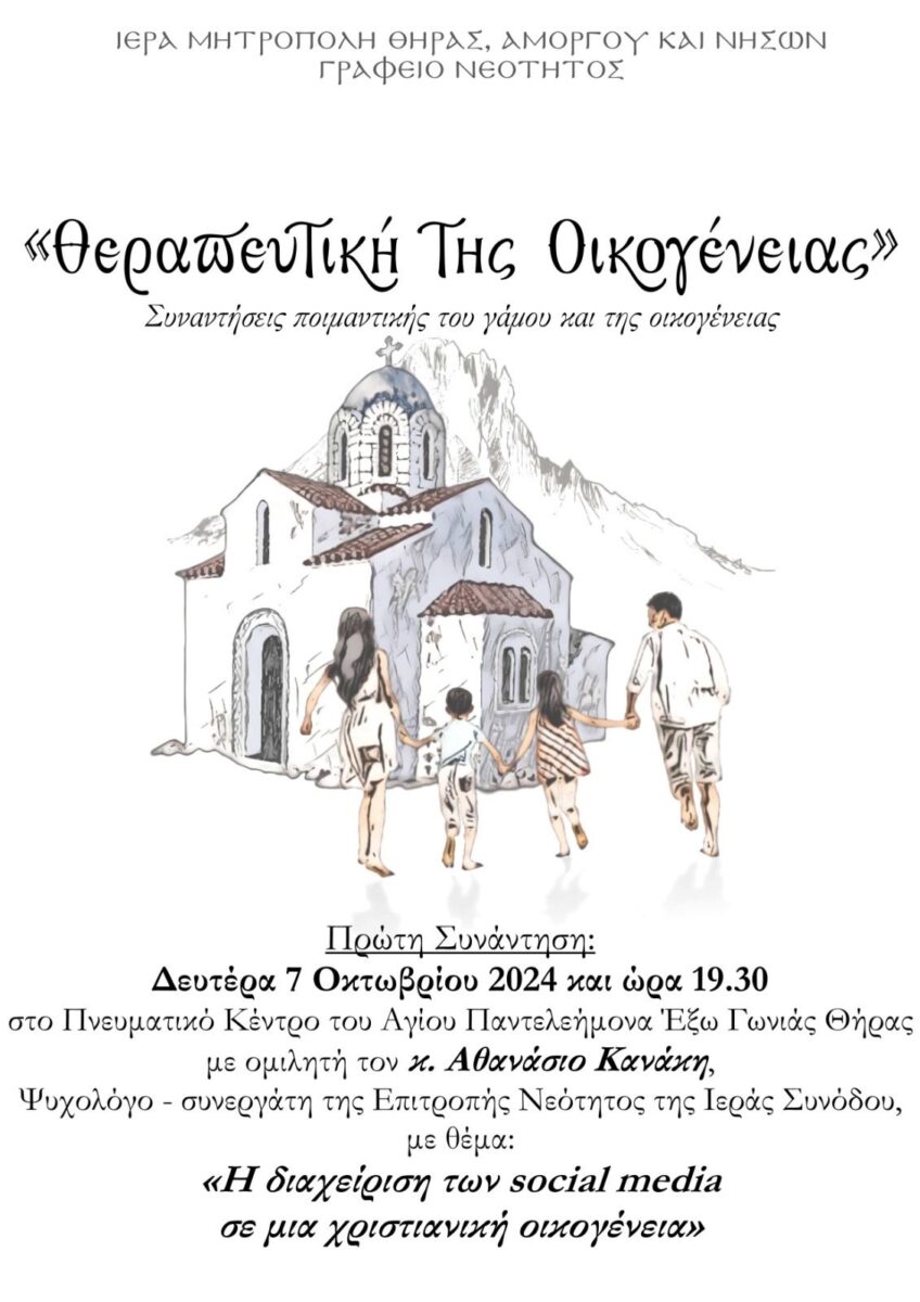 Τη Δευτέρα 7 Οκτωβρίου 2024 και ώρα 19.30 στο Πνευματικό Κέντρο του Αγίου Παντελεήμονα Έξω Γωνιάς Θήρας έγινε η πρώτη συνάντηση της “Θεραπευτικής της οικογένειας”, μιας νέας ποιμαντικής προσπάθειας του Γραφείου Νεότητας της Μητροπόλεως, κατά την οποία θα πραγματοποιούνται συναντήσεις ποιμαντικής του γάμου και της οικογένειας με καλεσμένους επιστήμονες και κληρικούς αναπτύσσοντας θέματα σχετικά με την οικογένεια και την οικογενειακή πνευματική ζωή στη σύγχρονη εποχή. Πρώτος φιλοξενούμενος ομιλητής ο κ. Αθανάσιος Κανάκης, Ψυχολόγος της Ελληνικής Αστυνομίας και συνεργάτης της συνοδικής επιτροπής επί της Χριστιανικής Αγωγής και της Νεότητος με θέμα “Η διαχείριση των social media σε μια χριστιανική οικογένεια”.