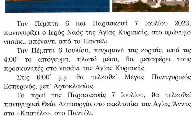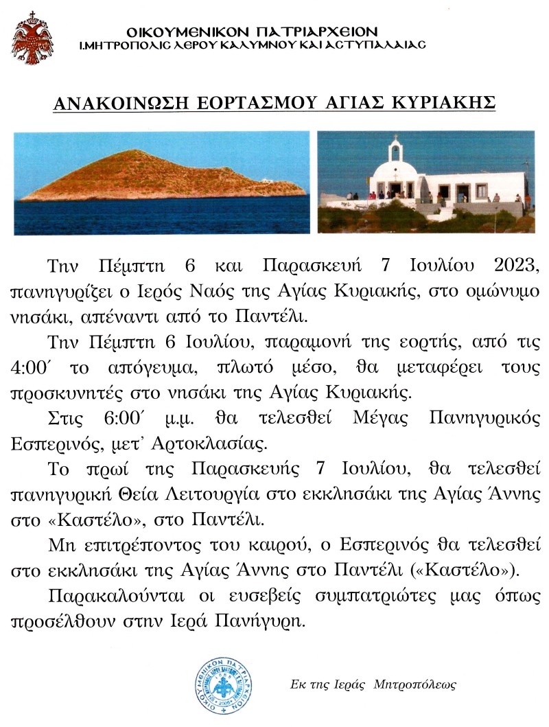 Η εορτή της Αγίας Κυριακής στο ομώνυμο νησάκι, δίπλα στην Κάλυμνο, θα πραγματοποιηθεί σύμφωνα με το κάτωθι Πρόγραμμα: