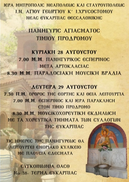 Με εκκλησιαστική λαμπρότητα τα τιμηθεί η εορτή της Αποτομής της Τ. Κεφαλής του Προδρόμου, την Κυριακή και Δευτέρα, 28 και 29 Αυγούστου, σύμφωνα με το κάτωθι Πρόγραμμα του Ναού: