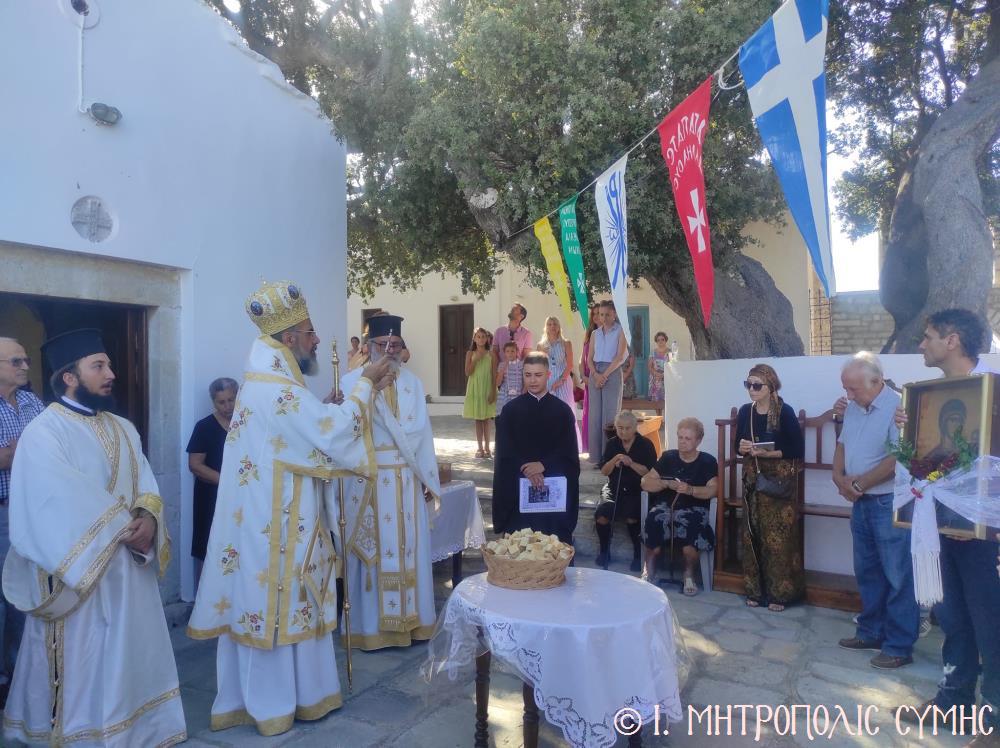 Την 24η Σεπτεμβρίου 2023, Κυριακή Α΄ Λουκᾶ καί ἡμέρα Συνάξεως τῆς Παναγίας τῆς «Μυρταριώτισσας», ὅπως λέγεται στήν Σύμη, ὁ Σεβ. Μητροπολίτης Σύμης κ. Χρυσόστομος χοροστάτησε στόν Ὄρθρο καί τέλεσε τήν Θεία Λειτουργία στό ὁμώνυμο Ἱ. Ἐξωκκλήσιο, πού βρίσκεται σέ περίοπτη θέση στήν ἐνδοχώρα τῆς Νήσου. Συλλειτουργούς του εἶχε τόν π. Στέφανο Μακρῆ Γεν. Ἀρχιερατικό Ἐπίτροπο καί τόν Ἱεροδιάκονο π. Παῦλο Τερεζάκη, ἐνῶ τό Ἱ. Ἀναλόγιο διακόνησαν οἱ Ἱεροψάλτες κ. Δημοσθένης Γιανναράς καί κ. Ἐλευθέριος Ξηράκης.