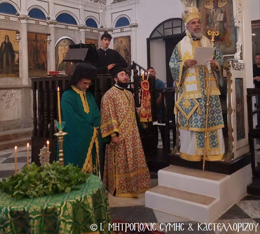 Ἐν συνεχείᾳ ἐτελέσθη ἡ Θ. Λειτουργία, κατά τήν ὁποία ὁ Σεβ. Ποιμενάρχης μας κ. Χρυσόστομος ὁμίλησε ἐπίκαιρα στό πολυπληθές ἐκκλησίασμα γιά τό νόημα τῆς ἑορτῆς τῆς Ὑψώσεως καί τήν μεγίστην Χάριν τοῦ Τιμίου καί Ζωοποιοῦ Σταυροῦ. Ἐπί δέ τῷ τέλει ἐντελῶς ἀπροσδόκητα, κάλεσε τόν Ἀρχιερατικό Ἐπίτροπο π. Νικόδημο καί σεπτῇ Πατριαρχικῇ ἐντολῇ τῆς Α.Θ.Π. τοῦ Οἰκουμενικοῦ Πατριάρχου κ. κ. Βαρθολομαίου, κατόπιν σχετικῆς εἰσηγήσεως Αὐτοῦ (τοῦ Μητροπολίτου μας), τοῦ ἀπένειμε τό ὀφφίκιον τοῦ Ἀρχιμανδρίτου τοῦ Οἰκουμενικοῦ Θρόνου, ἀναγινώσκων τό σχετικό Πατριαρχικό Πιττάκιο, ἀναφωνῶν μετά τοῦ λαοῦ, τό «Ἄξιος». Ἐν συνεχείᾳ μέ τόν μεστό καί περιεκτικό του λόγο, ἀπευθυνόμενος στόν νέο ὀφφικιοῦχο κληρικό μας, τόν εὐχαρίστησε γιά τήν διακεκριμένη ἐκκλησιαστική διακονία του στήν ἀκριτική μας Μεγίστη, προτρέπων αὐτόν νά συνεχίσει τήν ἄσκηση τῶν ἱερατικῶν του καθηκόντων μέ τόν ἴδιο καί ἔτι περισσότερον ἱερό ζῆλο, αὐταπάρνηση καί αὐτοθυσιαστική προσφορά πρός τόν Θεό καί τούς ἀνθρώπους. Σημειώνεται δέ, ὅτι ὁ π. Νικόδημος, ἐκτός τῶν Ἐνοριακῶν καί Μοναστηριακῶν ἀναγκῶν, ἔχει καί τήν ποιμαντική εὐθύνη τοῦ ἐκεῖ στρατιωτικοῦ σχηματισμοῦ καί διακονεῖ θεοφιλῶς καί ἀόκνως τά Στελέχη καί τούς Ὁπλῖτες τοῦ ἀκριτικοῦ μας Καστελλορίζου.