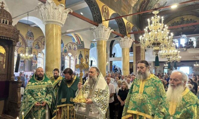 Ο Σεβασμιώτατος Μητροπολίτης Τρίκκης κ. Χρυσόστομος, το Σάββατο 13 Σεπτεμβρίου 2025 το απόγευμα, επικεφαλής του Ιερού Κλήρου και του ευσεβούς λαού, υποδέχθηκε έμπροσθεν των προπυλαίων του Ιερού Ναού Αγίων Κωνσταντίνου και Ελένης Τρικάλων τεμάχιο του Τιμίου και Ζωοποιού Σταυρού. Στη συνέχεια χοροστάτησε κατά την Ακολουθία του Εσπερινού με την ευκαιρία της εορτής της Παγκόσμιας Υψώσεως […]