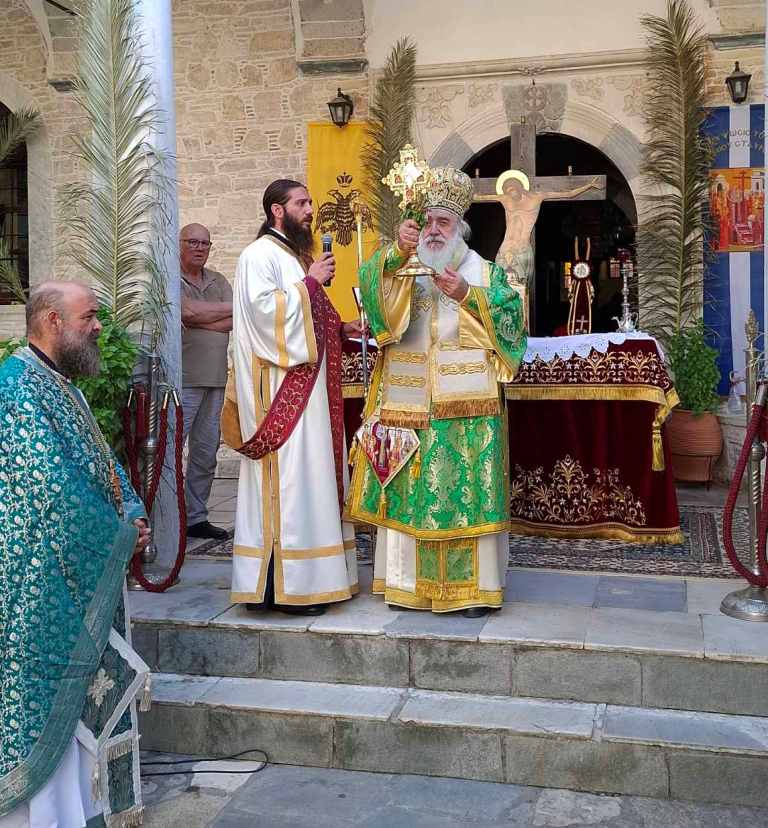 Ὁ Σεβασμιώτατος Ποιμενάρχης μας την παραμονή τῆς ἑορτῆς, προέστη τῆς καθόδου τοῦ Τιμίου Ξύλου ἀπό τό σκευοφυλάκιο τῆς Ἱερᾶς Μονῆς, χοροστάτησε στόν Πανηγυρικό Ἑσπερινό καί κήρυξε τό θείο λόγο ὁμιλώντας ἐπίκαιρα και ἀναφερθείς μεταξύ ἄλλων στό τεμάχιο τοῦ Τιμίου Ξύλου πολύτιμο κειμήλιο καί θησαυρό τῆς Τοπικῆς μας Ἐκκλησίας, ὃπου φυλάσσεται στην Ἱερά μας Μονή, δῶρο του ἐκ Χώρας Σάμου καταγόμενου Πατριάρχου Ιεροσολύμων Κυρίλλου του Β΄ (1815).