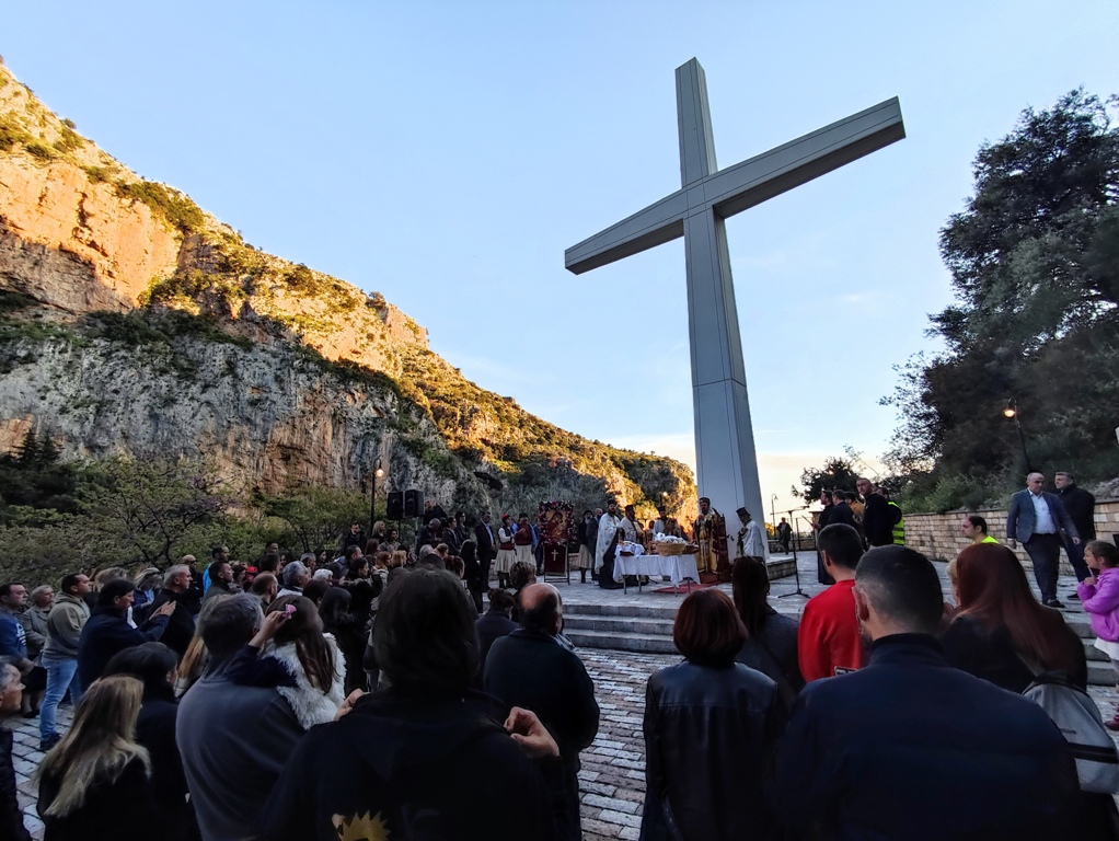 Πριν την απόλυση του Εσπερινού, με λιτανευτική πομπή, μεταφέρθηκε η ιερά Εικόνα πλησίον του Παρεκκλησίου του Τιμίου Σταυρού, όπου έχει ανυψωθεί ένας υπερμεγέθης Σταυρός, ύψους 16 μέτρων και εκεί τελέσθηκε η αρτοκλασία και ο Σεβασμιώτατος μίλησε στους προσκυνητές, μεταξύ των οποίων ήταν ο Βουλευτής Αιτωλοακαρνανίας κ. Σπήλιος Λιβανός και ο Πολιτευτής κ. Θανάσης Παπαθανάσης. Είναι η πρώτη φορά που τελέσθηκε αυτή η ιερά λιτανεία, στην οποία οι προσκυνητές συμμετείχαν με πολλή ευλάβεια και συγκίνηση.