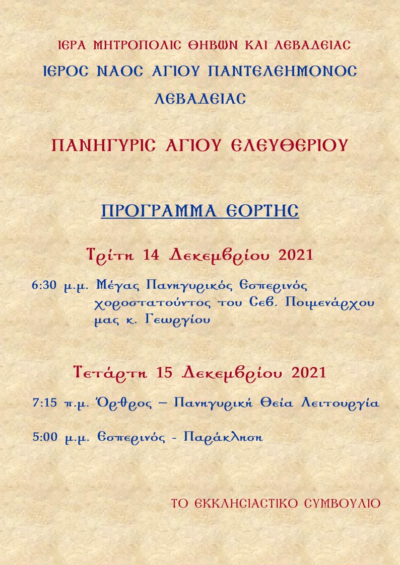 Η εορτή του Αγίου Ελευθερίου στη Μητρόπολη Θηβών ΕΛΛΑΔΑ, ΜΗΤΡΟΠΟΛΕΙΣ 13.12.2021 | 11:54 Η εορτή του Αγίου Ελευθερίου στη Μητρόπολη Θηβών. Η Ιερά Μητρόπολη Θηβών πανηγυρίζει επί τη εορτή του Αγίου Ελευθερίου, σύμφωνα με το Πρόγραμμα: