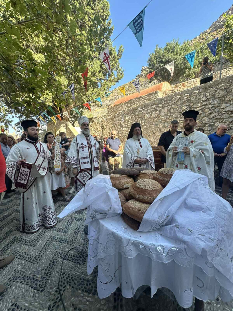 Τό ἑσπέρας τοῦ Σαββάτου, ὁ Σεβ. Μητροπολίτης μας κ. Χρυσόστομος, εἰς τό Καθολικό τῆς Ἱερᾶς Μονῆς, χοροστάτησε τοῦ Μεγάλου πανηγυρικοῦ Ἑσπερινοῦ, συμπαραστατούμενος ἀπό τούς προαναφερομένους κληρικούς, παρουσίᾳ τῆς Δημάρχου Τήλου κ. Μαρίας Καμμᾶ, τοῦ κ. Ἐμμανουήλ Χατζηφούντα ἐπικεφαλῆς τῆς Ἀξιωμ. Ἀντιπολιτεύσεως, ἑτέρων Δημοτικῶν Συμβούλων, τῶν λοιπῶν Στρατιωτικῶν, Ἀστυνομικῶν καί Λιμενικῶν Ἀρχῶν, ὡς καί πολλῶν φιλαγίων Χριστιανῶν, ἐνῶ πρό τῆς Ἀπολύσεως ἐτελέσθη ἡ Ἀρτοκλασία στόν χαλικόστρωτο ἐξωτερικό περίβολο τῆς Μονῆς, ἔμπροσθεν τῆς ἀειρρόου Πηγῆς τοῦ Ἁγίου. Ἀργότερα τό βράδυ, πραγματοποιήθηκε στούς αὔλιους χώρους τῆς ἱστορικῆς Μονῆς, κάτω ἀπό τόν πανύψηλο ὀχυρωματικό πύργο καί τά αἰωνόβια πλατάνια τό πατροπαράδοτο λαϊκό γλέντι μέ ντόπια μουσικά ἀκούσματα, χορούς καί πλούσια ἐδέσματα προσφερόμενα στήν Μονή γιά τόν σκοπό αὐτό, ἀπό εὐσεβεῖς προσκυνητές.