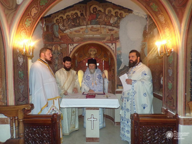 Σήμερα, 4 Δεκεμβρίου 2015, πλαισιωμένος από Κληρικούς της Ι. Μητρόπολης μας ο Σεβασμιώτατος Ποιμενάρχης τέλεσε τον Όρθρο, την Ιερά ακολουθία της Εκπλύσεως της Αγίας Τραπέζης, καθώς και αυτή της Καθιερώσεως Αντιμηνσίων στο ανακαινισθέν πανηγυρίζον Ι. Μητροπολιτικό Παρεκκλήσιο του Αγίου Σεραφείμ και εν συνεχεία την Θεία Λειτουργία. Στους παρισταμένους, μεταξύ των οποίων ήσαν και αντιπροσωπείες των Μοναστικών Αδελφοτήτων της Ι. Μητροπόλεως μας, ο Σεβ. Ποιμενάρχης μας ομίλησε για την σημασία του Επισκοπικού Μεγάρου για την πόλη της Κορίνθου, την ιστορικότητα του Παρεκκλησίου και τα μεγαλόπνοα σχέδια του προκατόχου του μακαριστού Δαμασκηνού του Παπανδρέου, του μετέπειτα Αρχιεπισκόπου και Αντιβασιλέως, ο οποίος είναι και ο κτήτωρ αυτού.