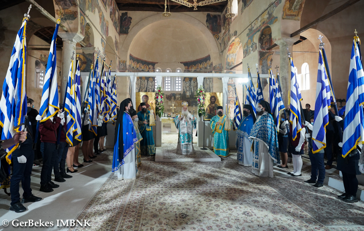 Το πρωί της κυριώνυμης ημέρας, σήμερα, στον Όρθρο και στη Θεία Λειτουργία χοροστάτησε και ιερούργησε ο Μητροπολίτης Βεροίας κ. Παντελεήμων, ο οποίος, αναφερόμενος στην Εθνική Εορτή, μεταξύ άλλων, είπε: «Ἐκεῖνοι ἔδωσαν τή ζωή τους γιά νά ζοῦμε ἐμεῖς ἐλεύθεροι, καί δικό μας χρέος εἶναι νά διατηροῦμε αὐτή τήν ἐλευθερία μέ σεβασμό στίς ἀρχές καί τίς ἀξίες ἀπό τίς ὁποῖες διαπνεόταν καί ἐκεῖνοι, χωρίς νά ἀπεμπολοῦμε τά δικαιώματά μας καί κυρίως χωρίς νά ἀπαρνούμεθα τήν ἀγάπη μας πρός τήν πατρίδα, ἔτσι ὥστε νά ἔχουμε πάντοτε τήν Παναγία μας προστάτιδα καί βοηθό μας στούς δύσκολους καιρούς πού διέρχεται ἡ πατρίδα μας καί ὁ κόσμος».