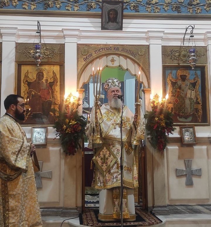 Στην Ιερά Αγρυπνία προσήλθε και χοροστάτησε στης ιερές Ακολουθίες του Εσπερινού και του Όρθρου ο Μητροπολίτης Χαλκίδος κ. Χρυσόστομος, ο οποίος προσέφερε και την Θεία Λειτουργία με συλλειτουργούς του τους Αρχιμ. Νικόδημο Ευσταθίου-Πρωτοσύγκελλο της Ι. Μητροπόλεως, Πορφύριο Γερμανό-Εφημέριο της εκεί Ενορίας, Νικόλαο Πριμηκύριο-ιερατικώς προϊστάμενο της Ενορίας Τιμίου Προδρόμου Χαλκίδος, τον Ιερομον. Αθανάσιο Φουρκή και τον Διάκ. Σταύρο Καλαφάτη.