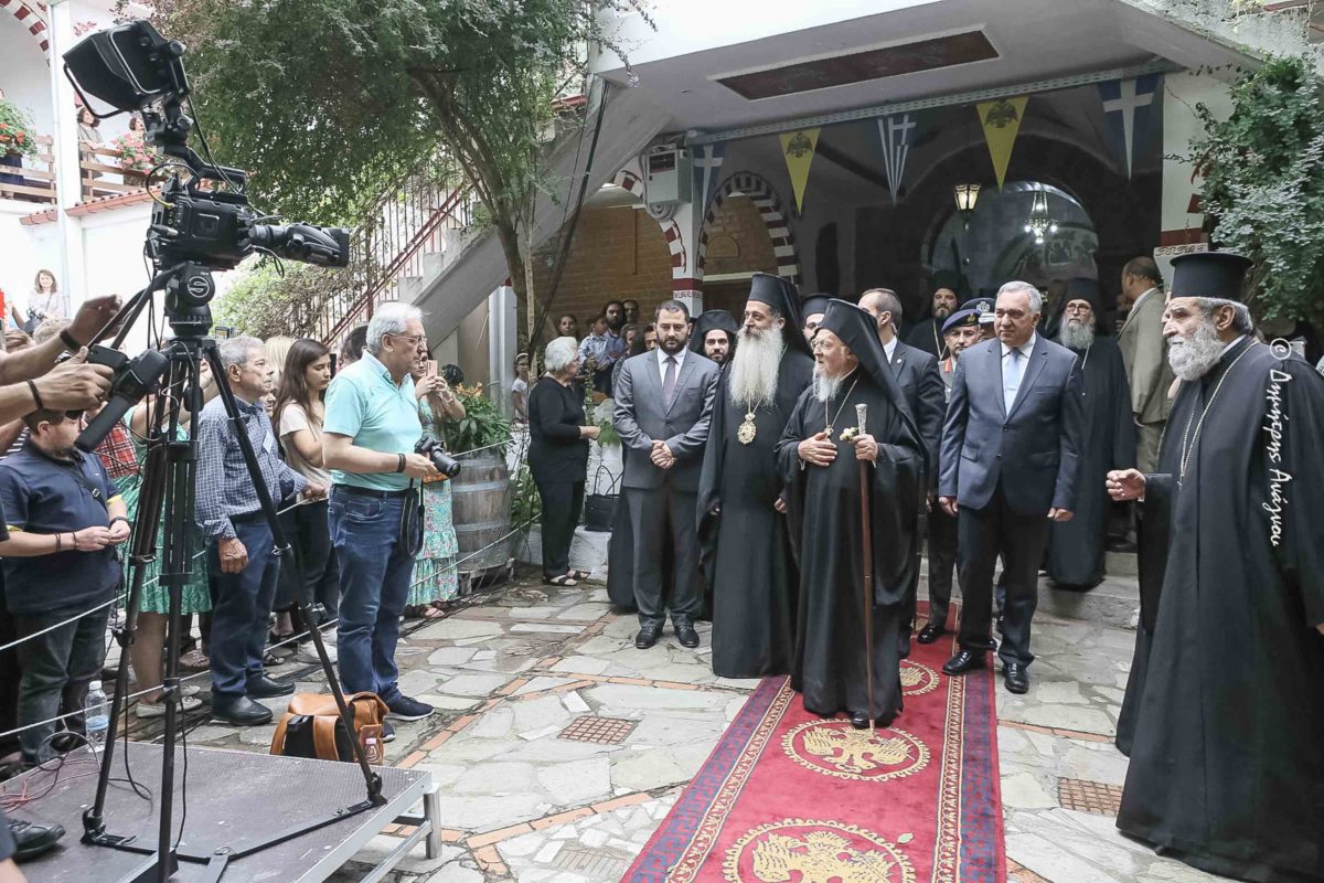 Τον Παναγιώτατο Οικουμενικό Πατριάρχη προσεφώνησε ο Σεβασμιώτατος Μητροπολίτης Φθιώτιδος κ. Συμεών, ενώ με την ιδιότητα του Προέδρου της Ειδικής Συνοδικής Επιτροπής Θείας και Πολιτικής Οικονομίας και Οικολογίας, παρουσία Συνοδικών Αρχιερέων και μελών της Επιτροπής, προσέφερε εκ μέρους του Μακαριωτάτου Αρχιεπισκόπου Αθηνών και πάσης Ελλάδος κ.κ. Ιερωνύμου του Β΄, Προέδρου της Ιεράς Συνόδου της Εκκλησίας της Ελλάδος, τιμητική διάκριση στον Παναγιώτατο εις ένδειξη τιμής και ευγνωμοσύνης στο πρόσωπο του για την μεγάλη και σημαίνουσα προσφορά του σε θέματα Περιβάλοντος και Οικολογίας, καθώς και στις αμέτρητες δράσεις ευαισθητοποίησης σε παγκόσμια κλίμακα για θέματα της οικολογίας και της κλιματικής κρίσης.