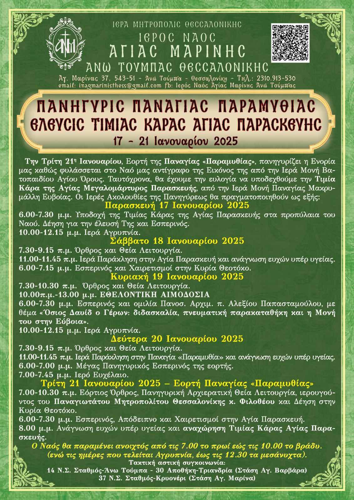 Την Κάρα της Αγίας Παρασκευής θα υποδεχθεί ο Ι. Ναός Αγίας Μαρίνης, στην Άνω Τούμπα Θεσσαλονίκης, σύμφωνα με το ακόλουθο Πρόγραμμα: