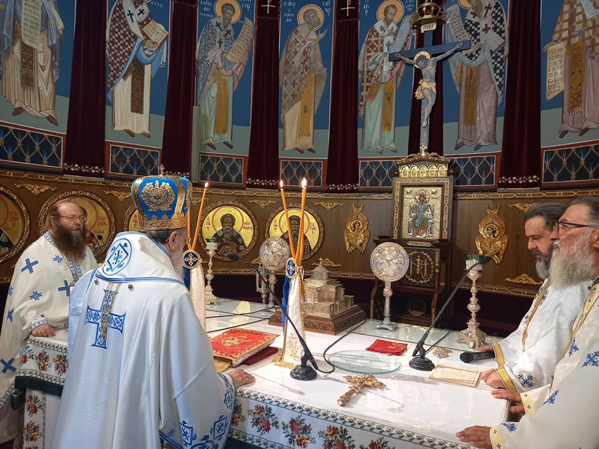 Ο Θεοφιλέστατος Επίσκοπος Κεγχρεών κ. Αγάπιος με την ευκαιρία της εορτής των Αγ. Αποστόλων Σίλα και Επαινετού λειτούργησε την Κυριακή, 30 Ιουλίου 2023, στον Ι. Ναό Γενεσίου της Θεοτόκου (Παναγίας Γιάτρισσας) Λουτρακίου, όπου υπάρχουν καθαγιασμένα Άγια Θυσιαστήρια επ᾿ ονόματί Τους και συγκεκριμένα ετέλεσε την Θ. Λειτουργία στο δεξιό θυσιαστήριο του επ᾿ ονόματι του Αγίου Σίλα καθαγιασμένου, συλλειτουργούντων των Αιδεσιμολογιωτάτων π. Δανιήλ Ρόμπου, Κληρικού της Ι. Μητροπόλεως Γουμενίσσης, Αξιουπόλεως και Πολυκάστρου, ο οποίος έλκει την καταγωγή του εκ Ρουμανίας και του π. Νικολάου Βασιλοπούλου, Εφημερίου του εν λόγω Ι. Ναού.