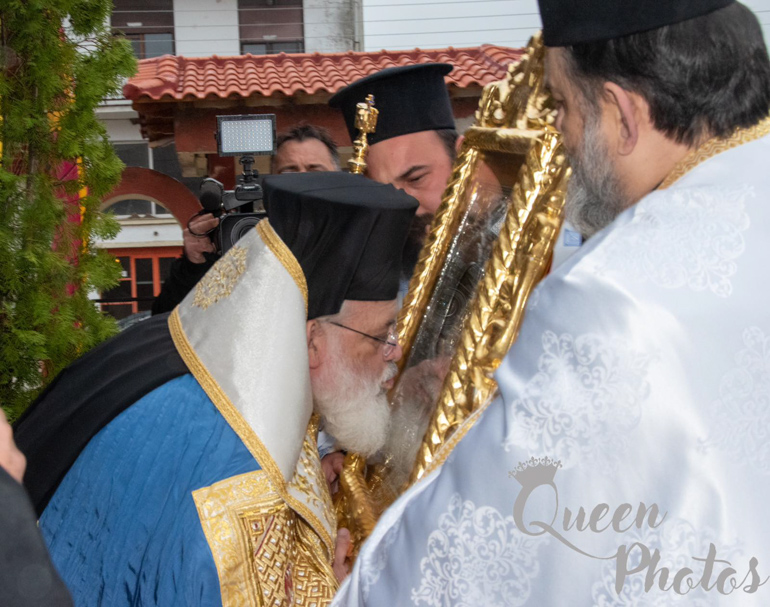 Με πολλή διακριτικότητα και λιτά, άνευ περιττών εκδηλώσεων, λόγω του πένθους, εγένετο στα προπύλαια του Ιερού Ναού η υποδοχή της ιεράς εικόνος, την οποία συνώδευε ο Σεβ. Μητροπολίτης Αλεξανδρουπόλεως κ. Άνθιμος.
