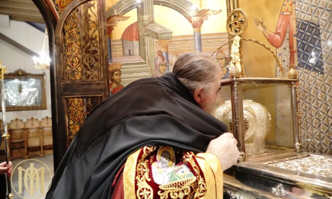 Πλήθος κόσμου, από την πόλη μας αλλά και από άλλες περιοχές και ομόδοξοι αδελφοί μας, προσήλθαν στον περίλαμπρο Προσκυνηματικό Ιερό Ναό του αγίου Δημητρίου του Πολιούχου, για να προσκυνήσουν τα θαυματουργά ιερά Λείψανά του, καθώς και την θαυματουργή ιερά εικόνα της Παναγίας Φανερωμένης Βαθυρρύακος, ώστε να λάβουν την χάρη και την ευλογία από τα ιερά προσκυνήματα και να συμμετάσχουν στις εορταστικές εκδηλώσεις της έναρξης της Μεγάλης Εβδομάδος του Αγίου μας.