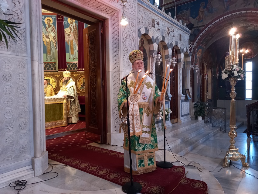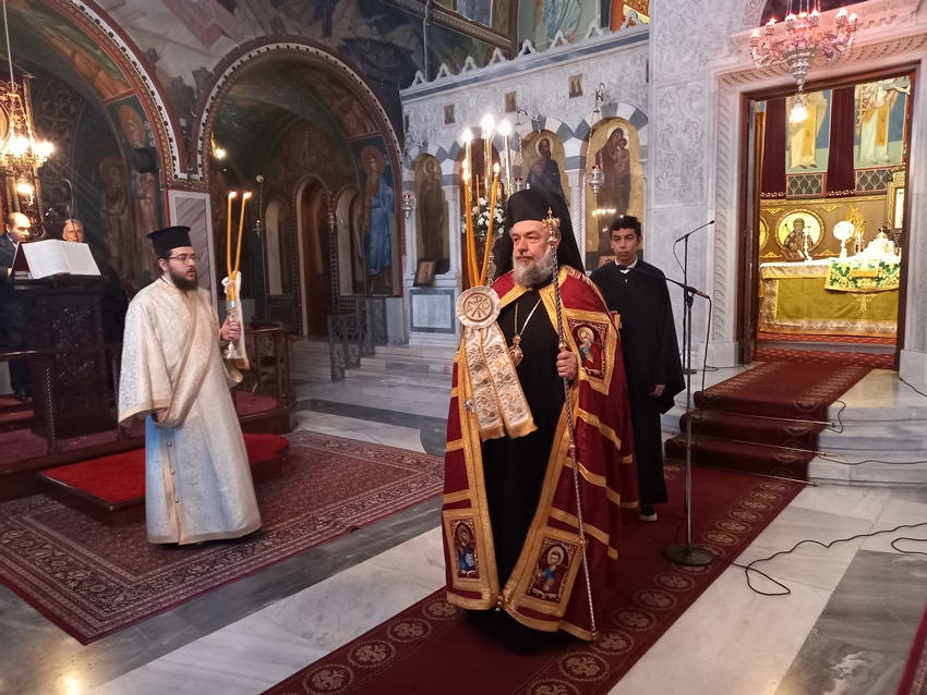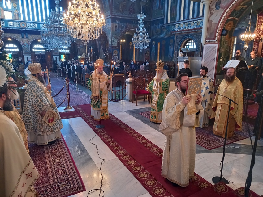 Τον Θείο λόγο κήρυξε ο Σεβασμιώτατος κ. Νικηφόρος, ο οποίος αναφέρθηκε στις δύο προηγούμενες Κυριακές του Τριωδίου τονίζοντας ότι ο εγωκεντρισμός και η απομάκρυνση από την πατρική αγάπη και στέγη οδηγεί τον άνθρωπο στην αποξένωση απ’ την μόνη πηγή της ζωής, τον Θεό. Ο φαρισαϊκός εγωκεντρισμός και οι δραστηριότητες που περιορίζονται στα όρια των βιολογικών αναγκών είναι οι κύριες αιτίες της υλιστικής αντίληψης της ζωής και της θεώρησης των πάντων με κέντρο τον εαυτό μας. Η έλλειψη επικοινωνίας, διαπροσωπικών σχέσεων και η απουσία αγάπης οδηγούν σε μια ζωή χωρίς μετάνοια καταδικασμένη στην εξορία και την απομάκρυνση από την Πατρική εστία. Μια εβδομάδα πριν την Μεγάλη Τεσσαρακοστή καλούμαστε να επανεξετάσουμε τον εαυτό μας, τις πράξεις μας και την ζωή μας ολόκληρη με γνώμονα την σωτηρία. Καλούμαστε να αποτινάξουμε τον ζυγό της ραθυμίας και να επαναπροσδιορίσουμε τους στόχους μας προς την ατελεύτητη μακαριότητα στην Πατρική αγκαλιά, απλώνοντας το χέρι μας και ανοίγοντας την καρδιά μας στον συνάνθρωπο. Κριτήριο της Μέλλουσας Κρίσης είναι η άσκηση της αγάπης και η στάση του ανθρώπου προς τον συνάνθρωπο. Σε καιρούς δύσκολους, απόγνωσης, αμφισβήτησης των πάντων και γενικής αλλοτρίωσης το μήνυμα του Ευαγγελικού αναγνώσματος της Κυριακής των Απόκρεω είναι ότι την ζωή μας την κερδίζουμε, όταν «χαμηλώνουμε» το ανάστημά μας, όταν τα μάτια μας χύνουν δάκρυα αγάπης και μετάνοιας, όταν βγαίνουμε από το «καβούκι» μας και την εγωπάθεια μας και πλησιάζουμε τον συνάνθρωπο μας. Έτσι μπορούμε να κερδίσουμε τον Παράδεισο δίνοντας αγάπη στον διπλανό μας και σε όποιον έχει ανάγκη.