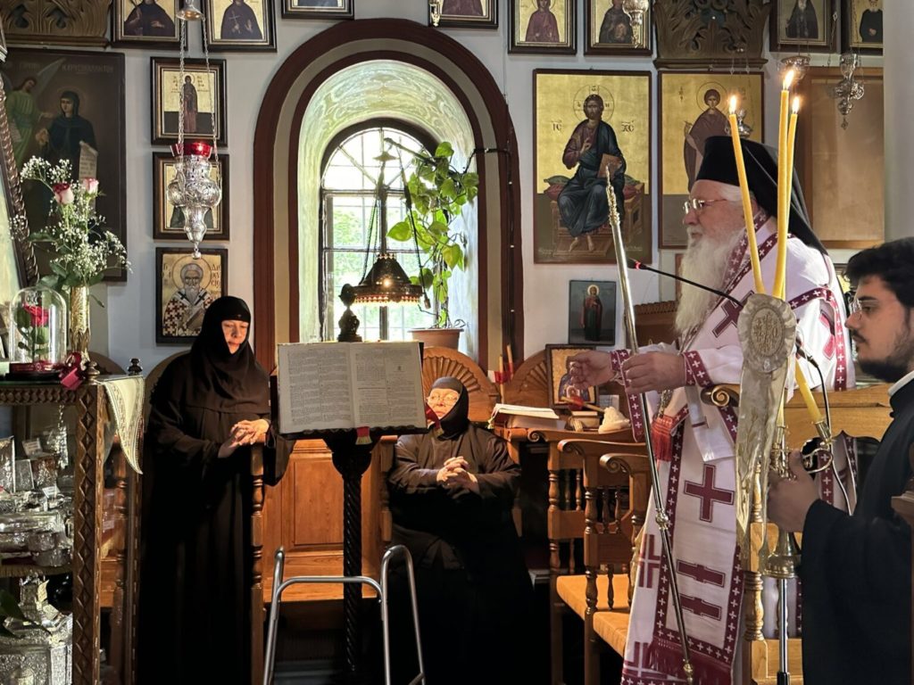 Μετά τη Θεία Λειτουργία ο Σεβασμιώτατος τέλεσε τρισάγιο στους τάφους των μακαριστών Γεροντισσών, που βρίσκονται δίπλα στο Ιερό Παρεκκλήσιο της Μονής που είναι αφιερωμένο στον Άγιο Παντελεήμονα.
