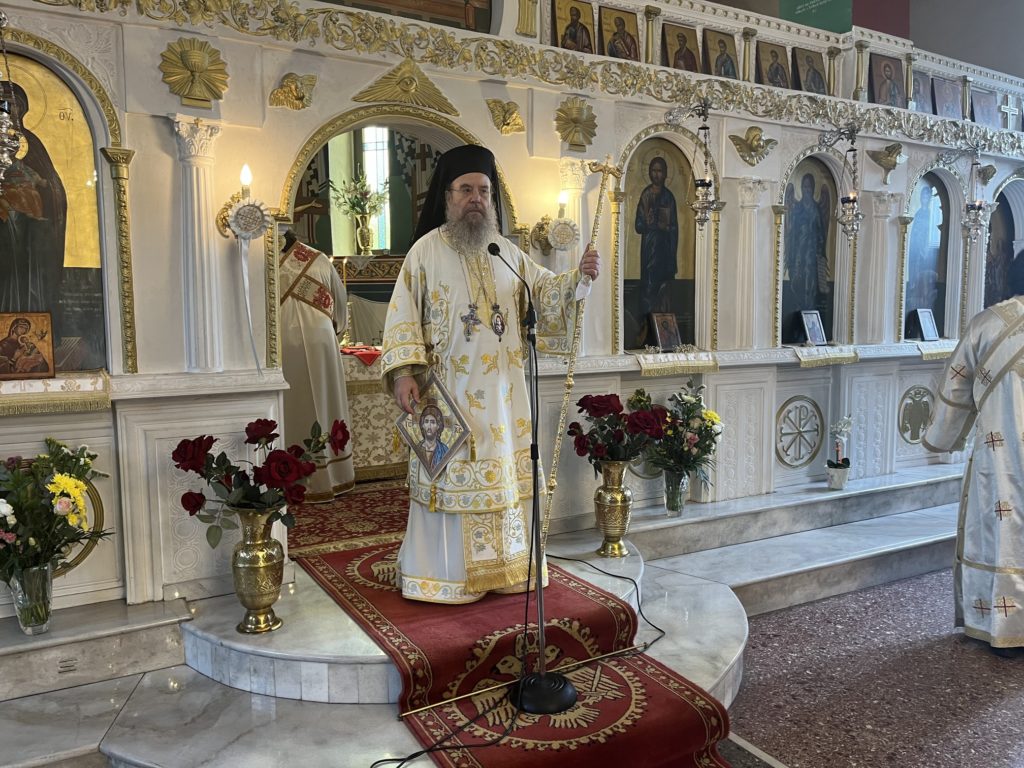 Στην ομιλία του ο Σεβασμιώτατος κάνοντας μνεία και του Αποστολικού Αναγνώσματος (Εβρ. ια΄33 – ιβ΄2) και της Ευαγγελικής Περικοπής (Ματθ. ι΄ 32-33, 37-38, ιθ΄ 27-30), παρεκάλεσε το Πλήρωμα της Εκκλησίας να στρέψη το βλέμμα του στην ιστόρηση – εικόνες των Αγίων μας που κοσμούν τόσο το Τέμπλο όσο και ιστορούν τα τοιχία και τα διαζώματα του Ιερού Ναού, όπως παραδείγματος χάριν στην Εικόνα του Αγίου Ενδόξου Προφήτου Προδρόμου και Βαπτιστού Ιωάννου, ο οποίος σε διακεκριμένο πινάκιο βαστάζει την αποτετμημένη κεφαλή του, ως να λέγη στον Κύριο: «Σου προσφέρω Κύριε το αίμα και την κεφαλή μου, ως αντίδωρο της περίσσειας της Αγάπης και της Χάριτος, με τα οποία Συ με Εβάπτισες»! Και όντως οι Εικόνες των Αγίων μας, λίγο ή πολύ, εξεικονίζουν και ιστορούν το τι ο καθένας κατέθεσε ως ατίμητο αντίδωρο στον Θρόνο της Χάριτος για να περιβληθή το δώρο της Χάριτος του Τριαδικού Θεού!