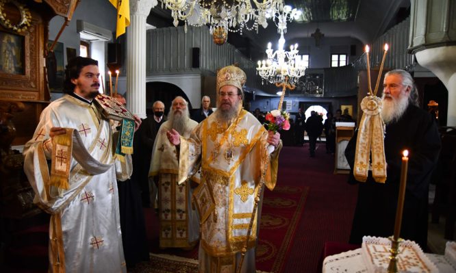 Στην ομιλία του ο Σεβασμιώτατος προέβαλε την αναγνωσθείσα υπέροχη Περικοπή από το κατά Ιωάννην Ευαγγέλιο, τη χαρακτηριζόμενη από την Εκκλησία ως υπερφυά – Αρχιερατική Προσευχή του Κυρίου μας, που την απηύθυνε προς τον Πατέρα Του κατά το εσπέρας της Μεγάλης Πέμπτης, λίγο προ της παραδόσεώς Του στους σταυρωτές Του, υπέρ Εαυτού, υπέρ των Αγίων Αποστόλων Του και υπέρ όσων θα πιστεύσουν σ’ Αυτόν, μέσω της Αποστολικής Διδαχής και Μαρτυρίας (Ιωαν. ιζ΄ 1-26). Πρόκειται για ένα μοναδικό κείμενο, που βγαλμένο από τα εσώψυχα του Θεανθρώπου Κυρίου μας, φανερώνει τη Θεανθρώπινη ιδιότητά Του, το έργο και τον σκοπό της κατά Χριστόν Οικονομίας, των Μεγαλείων, δηλαδή, που επετέλεσε ο Θεός στο Πρόσωπο και με το Πρόσωπο του Υιού Του, Κυρίου δε ημών Ιησού Χριστού, για να συνάξη και πάλι το ανθρώπινο Γένος στην Ουράνια Πατρίδα του, απ’ όπου- λόγω της πτώσης και της αμαρτίας- εξήλθε, γλιστρώντας στον θάνατο, κατά τον Άγιο Διάδοχο Φωτικής. Βεβαίως από το λαμπρό αυτό κείμενο κατά την παρούσα Κυριακή αναγινώσκεται το ήμισυ της εκτάσεώς του (Ιωάν. ιζ΄ 1-13), καθότι πρόκειται για μέγιστο ιερό κείμενο που συνήθως αναγινώσκεται εμμελώς τη Μεγάλη Πέμπτη το εσπέρας, ως πρώτο εκ των δώδεκα Περικοπών (Ευαγγελίων) των Παθών του Κυρίου.