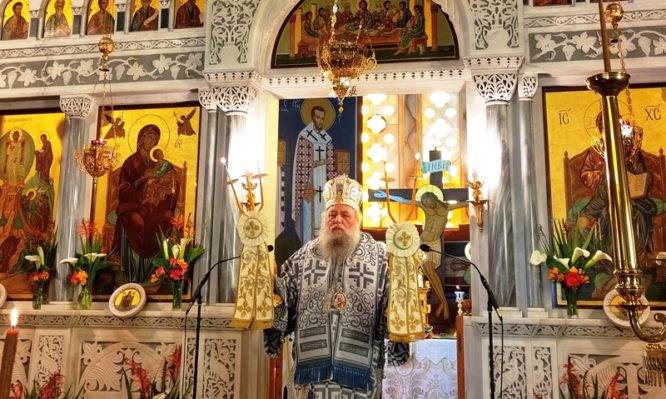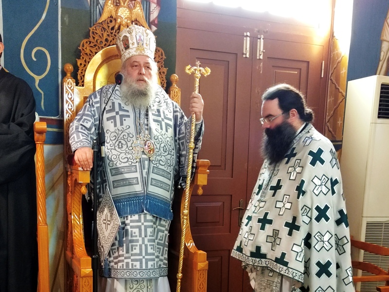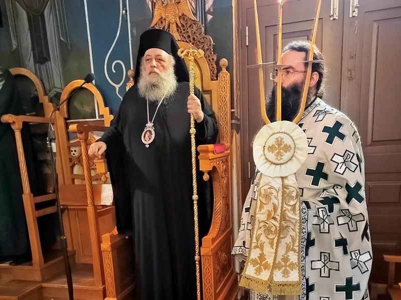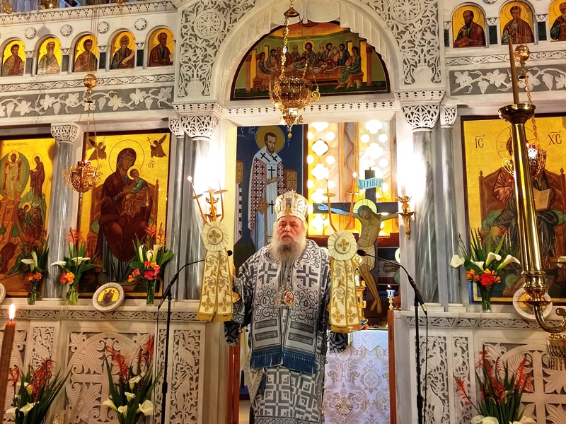 Ο Σεβασμιώτατος χοροστάτησε στον Όρθρο και προεξήρχε της Θείας Λειτουργίας, πλαισιούμενος από τον Εφημέριο του Ναού, Πρωτοπρ. Εμμανουήλ Τζιώτη.