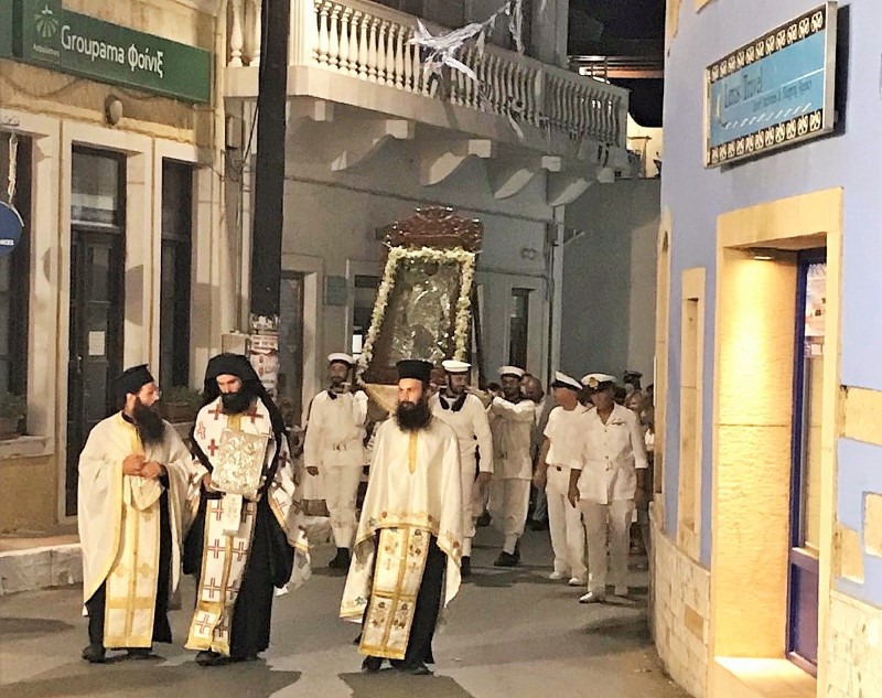 Η Φιλαρμονική του Δήμου απέδωσε τις κεκανονισμένες τιμές, ενώ άνδρες του πολεμικού ναυτικού βάσταζαν την Εικόνα της Αγίας Μαρίνας.
