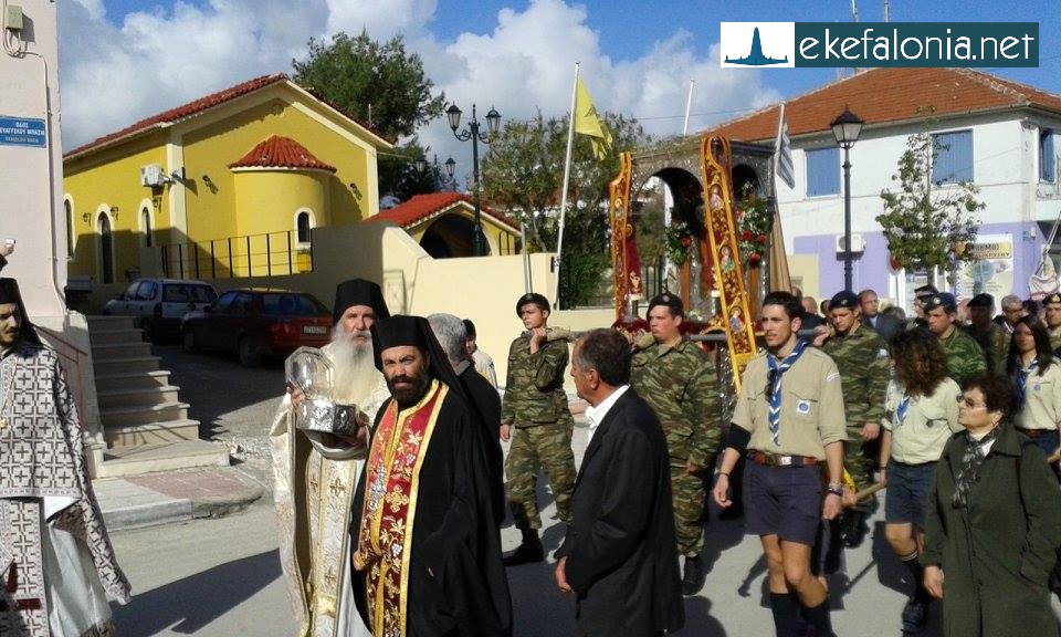 Νωρίς το πρωί τελέστηκε πανηγυρική Θεία Λειτουργία , στον ιερό μητροπολιτικό ναό Παντοκράτορα καθώς ο ναός που είναι αφιερωμένος στον Άγιο έχει υποστεί σοβαρές ζημιές από τους σεισμούς.