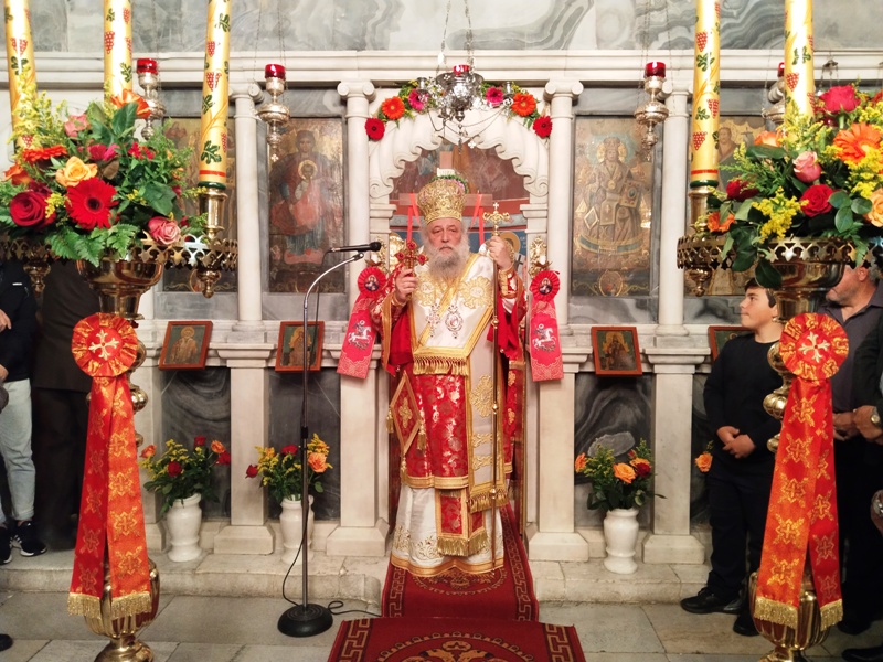 Κατά την διάρκεια του Κοινωνικού, ο Σεβασμιώτατος κήρυξε τον θείο λόγο και μετά την Απόλυση διένειμε το Αντίδωρο, τον άρτο και κόκκινα αυγά. Ακολούθησε η Λιτανεία της Ιεράς Εικόνος του Αγίου στα γραφικά σοκάκια του χωριού και μετά την ακροτελεύτια Δέηση, παρατέθηκαν στον αύλειο χώρο του ναού, πλούσια παραδοσιακά εδέσματα και γλυκίσματα από τις νοικοκυρές του χωριού.