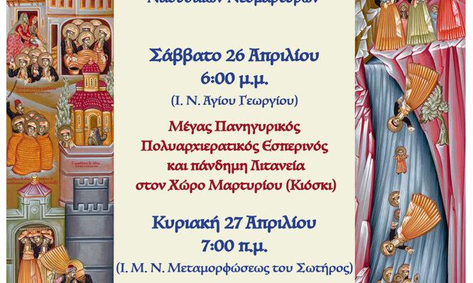 Το Σάββατο 26 Απριλίου, στις 6:00 μ.μ., στον Ιερό Ναό του Αγίου Γεωργίου Ναούσης θα τελεστεί Μέγας Πανηγυρικός Πολυαρχιερατικός Εσπερινός. Ακολούθως, θα πραγματοποιηθεί πάνδημη Λιτανεία προς τον Χώρο Μαρτυρίου (Κιόσκι), εκεί όπου οι πρόγονοί μας σφράγισαν με αίμα την πίστη και την ελευθερία.
