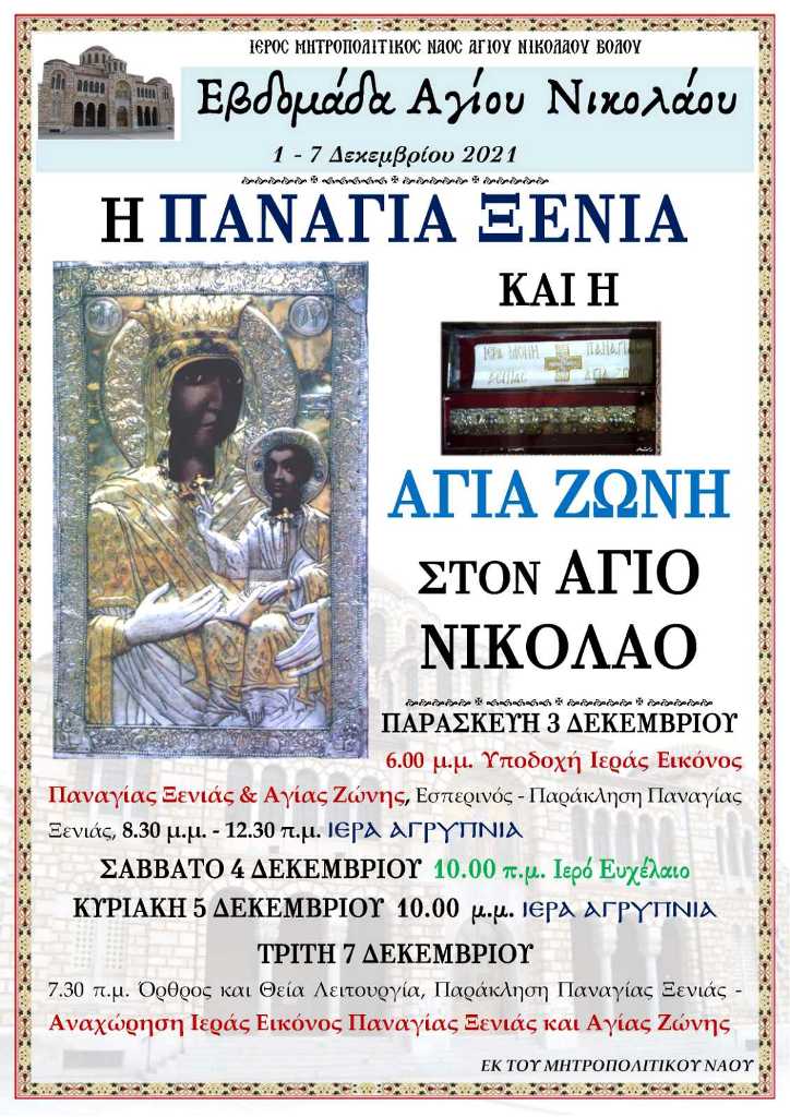 Σταθμό στην διάρκεια της Εβδομάδος του Αγίου Νικολάου θα αποτελέσει η έλευση της Ιεράς Εικόνος της Παναγίας Ξενιάς και της Αγίας Ζώνης στον Μητροπολιτικό μας Ναό, προς προσκύνηση και αγιασμό του λαού μας. Τα Ιερότατα κειμήλια θα αφιχθούν την Παρασκευή 3/12, στις 6μ.μ. και θα αναχωρήσουν την επομένη της Πανηγύρεως, 7/12.