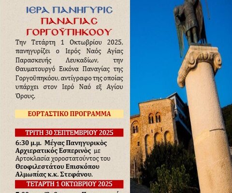 Ο ιερός ναός Αγίας Παρασκευής Λευκαδίων πανηγυρίζει την Θαυματουργό Εικόνα Παναγίας της Γοργοεπηκόου, αντίγραφο της οποίας υπάρχει στον Ιερό Ναό εξ Αγίου Όρους. ΕΟΡΤΑΣΤΙΚΟ ΠΡΟΓΡΑΜΜΑ ΤΡΙΤΗ 30/9 6.30 μ.μ. Αρχιερατικός Εσπερινός χοροστατούντος του Θεοφιλεστάτου Επισκόπου Αλμωπίας κ. Στεφάνου ΤΕΤΑΡΤΗ 1/10 7.00 π.μ. Όρθρος και Πανηγυρική Θεία Λειτουργία 6.30 μ.μ. Εσπερινὸς και Ιερά Παράκλησις της Παναγίας […]