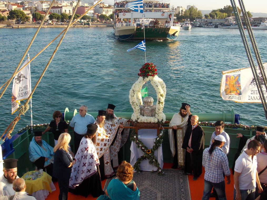 Η Τίμια Κάρα, μεταφέρθηκε αρχικά στην ιχθυόσκαλα όπου τελέστηκε αγιασμός και μεταφέρθηκε μέσω πλοιαρίου στον μώλο της Αγίου Νικολάου. Ακολούθως, τελέστηκε δοξολογία στην πλατεία Τριών Συμμάχων.