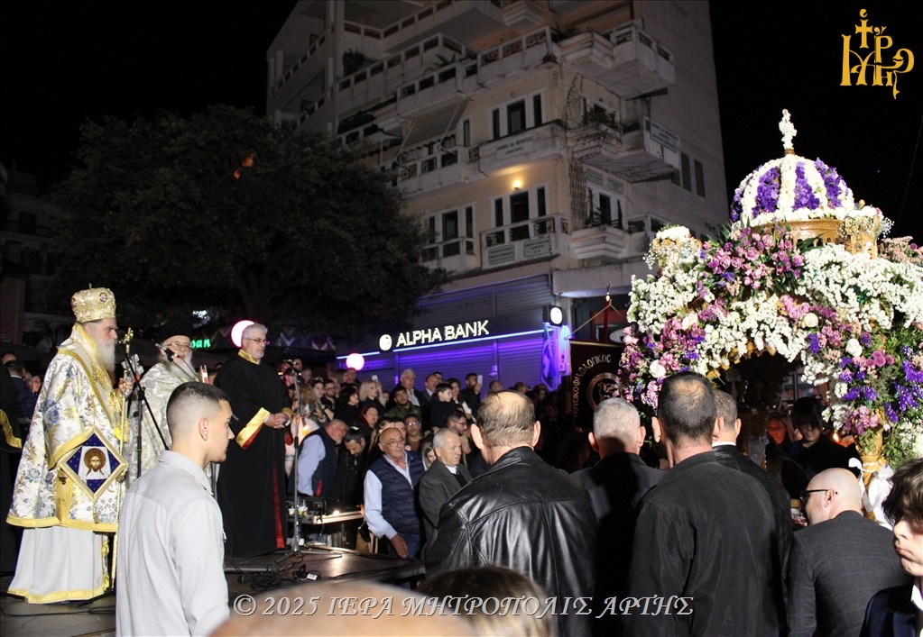 Πραγματοποιήθηκε η περιφορά του Επιταφίου του Μητροπολιτικού Ναού. Από την κεντρική πλατεία της πόλεως πέρασαν όλοι οι Επιτάφιοι των ενοριών, έμπροσθεν του Σεβασμιωτάτου Ποιμενάρχου Άρτης , ο οποίος εμνημόνευσε τους συμπολίτες μας Αρτινούς που σκοτώθηκαν κατά τον υπό των Γερμανών βομβαρδισμό (ώρα 12 το μεσημέρι του Μεγάλου Σαββάτου 19 Απριλίου 1941) της πόλεως Άρτας. Στο μήνυμά του, ο Σεπτός Ποιμενάρχης μας ετόνισε, ότι «ο Τάφος του Ιησού είναι η απαντοχή των πονεμένων».