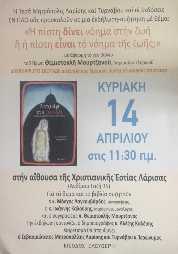 Η Ιερά Μητρόπολη Λαρίσης και Τυρνάβου και οι εκδόσεις «Εν Πλω» σας προσκαλούν σε μία εκδήλωση-συζήτηση με θέμα:«Η πίστη δίνει νόημα στη ζωή ή η πίστη είναι το νόημα της ζωής;»α