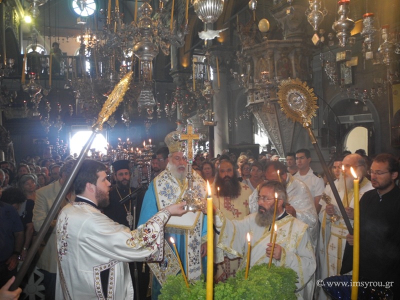 Ο Μητροπολίτης Σύρου κ. Δωρόθεος, πριν την τελετή της Προόδου, τέλεσε τη Θεία Λειτουργία, παρουσία πολλών κληρικών και τοπικών αρχόντων.