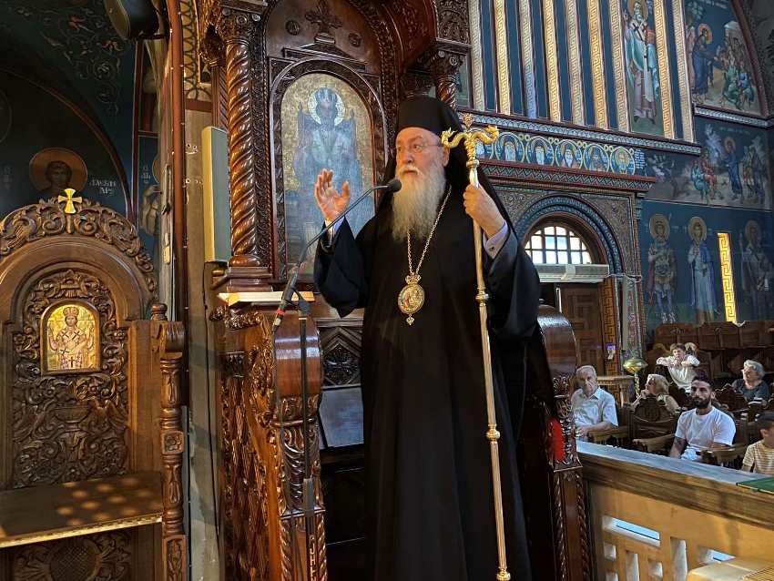Στο κήρυγμά του ο Σεβασμιώτατος αναφέρθηκε στον Ευαγγελισμό της Κοιμήσεως της Θεοτόκου, επισημαίνοντας ότι ο ίδιος ο Αρχάγγελος Γαβριήλ, που Της απηύθυνε τον ασπασμό και το «Χαίρε», δηλαδή, το χαρμόσυνο μήνυμα της ενανθρωπήσεως του Θεού, έρχεται τώρα να Της αναγγείλει ότι μετά από τρεις ημέρες θα εγκαταλείψει τα εγκόσμια αναχωρώντας για την αιώνια Βασιλεία κοντά στον Υιό Της και Θεό μας! Αμέσως η Θεοτόκος άρχισε να προετοιμάζεται ψυχοσωματικά για την ταφή και την κηδεία Της, ενώ οι Άγιοι Απόστολοι, που κήρυτταν στα πέρατα της γης το Ευαγγέλιο της Σωτηρίας, μεταφέρθηκαν θαυματουργικά στην Γεθσημανή, μαζί με τον Άγιο Διονύσιο τον Αρεοπαγίτη και τον Άγιο Ιερόθεο, πρώτο Επίσκοπο των Αθηνών, προκειμένου να κηδεύσουν το Θεοδόχο Σώμα της Παναγίας μας.