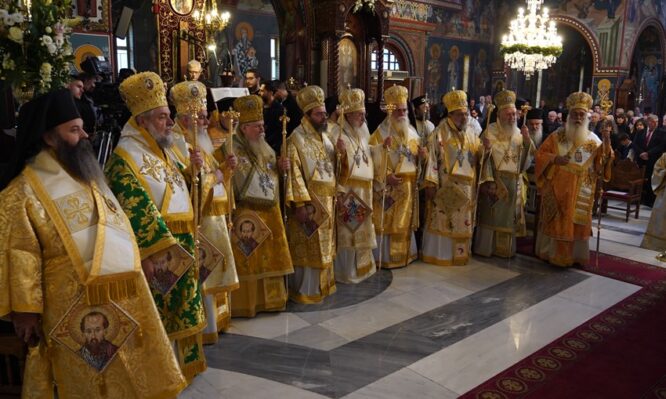Στην πολυαρχιερατική Θεία Λειτουργία, προεξήρχε ο σεπτός Ποιμενάρχης μας κ. Παύλος, συλλειτουργούντων των Σεβασμιωτάτων Μητροπολιτών Γουμενίσσης, Αξιουπόλεως και Πολυκάστρου κ. Δημητρίου, Ναυπάκτου και Αγίου Βλασίου κ. Ιεροθέου, Χαλκίδος και Βορείων Σποράδων κ. Χρυσοστόμου, Σερβιών και Κοζάνης κ. Παύλου, Μεσσηνίας κ. Χρυσοστόμου, Θηβών, Λεβαδείας και Αυλίδος κ. Γεωργίου, Άρτης κ. Καλλινίκου Ιλίου, Αχαρνών και Πετρουπόλεως κ. Αθηναγόρου, Κηφισίας, Αμαρουσίου, Ωρωπού και Μαραθώνος κ. Κυρίλλου, Νικοπόλεως και Πρεβέζης κ. Χρυσοστόμου, Μαρωνείας και Κομοτηνής κ. Παντελεήμονος, Γρεβενών κ. Δαβίδ, Φιλίππων, Νεαπόλεως και Θάσου κ. Στεφάνου, Φθιώτιδος κ. Συμεών, Καλαβρύτων και Αιγιαλείας κ. Ιερωνύμου, του και Τοποτηρητού της Ι. Μητροπόλεώς μας, Λήμνου και Αγίου Ευστρατίου κ. Ιεροθέου, Γόρτυνος και Μεγαλοπόλεως κ. Νικηφόρου, Μαντινείας και Κυνουρίας κ. Επιφανίου, του Βοηθού Επισκόπου Κεγχρεών κ. Αγαπίου, Πρωτοσυγκέλλου της Ι. Μητροπόλεως μας και συμπροσευχομένου του Βοηθού Επισκόπου Σκοπέλου κ. Νικοδήμου, Πρωτοσυγκέλλου της Ι. Μητροπόλεως Χαλκίδος.