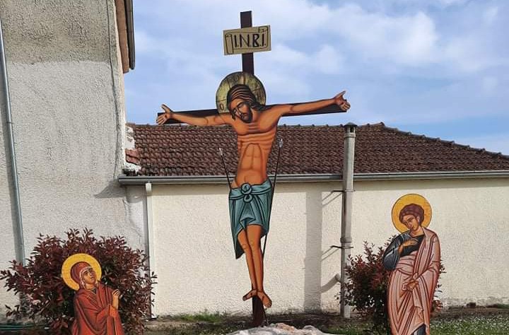 Η Σταύρωση και η Ανάσταση που κοσμούν τον αύλειο χώρο του Ιερού Ναού του Αγίου Γεωργίου του Τροπαιοφόρου στο Κεφαλόβρυσο Τρικάλων, κλέβουν κυριολεκτικά τις εντυπώσεις.