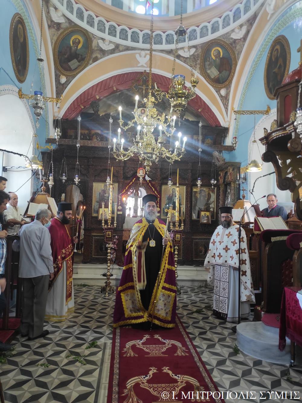 Ἔτσι λοιπόν, ο Μητροπολίτης κ. Χρυσόστομος χοροστάτησε στόν Ὄρθρο καί τέλεσε τήν Θεία Λειτουργία στόν Ἐνοριακό αὐτό Ἱ. Ναό μέ συλλειτουργούς του τόν Καθηγούμενο τῆς Ἱ. Μονῆς Πανορμίτου Ἀρχιμανδρίτη Ἀντώνιο Πατρό, τόν φιλοξενούμενο Ἀρχιμ. Ἰωσήφ Ἀδαμόπουλο, τόν Αἰδεσ. Πρεσβύτερο Ἀντώνιο Μανιᾶ, ἐφημέριο τοῦ Ἱ. Ναοῦ καί ὅλους τούς Ἐφημερίους τῶν παρακειμένων ἐνοριῶν τῆς Ἄνω Χώρας. Τά ἀναλόγια διηκόνησαν γλυκυφθόγγως ὁ Ἱεροψάλτης καί παράλληλα Ἐπίτροπος τοῦ Ἱ. Ναοῦ κ. Ἀγαπητός Μιχελῆς καί ὁ κ. Πανορμίτης Κακακιός.
