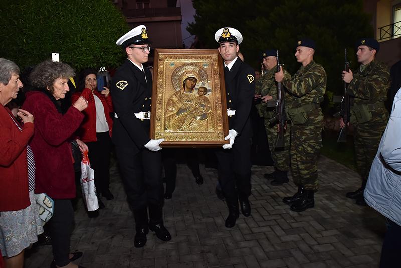 Η υποδοχή και ενθρόνιση στο Ναό της Ευαγγελιστρίας του γνησίου αντιγράφου της θαυματουργού εφέστιας Εικόνος «Παναγίας Βηματάρισσας», της Ιεράς Μεγίστης Μονής Βατοπαιδίου, είχε πραγματοποιηθεί την Πέμπτη 28 Νοεμβρίου 2019, από τον Σεβασμιώτατο Μητροπολίτη Πειραιώς κ. Σεραφείμ με την συμμετοχή του κλήρου και των αρχών της πόλεως του Πειραιά. Την Ιερά Εικόνα είχε κομίσει ο Καθηγούμενος της Ιεράς Μεγίστης Μονής Βατοπαιδίου, Αρχιμανδρίτης π. Εφραίμ.
