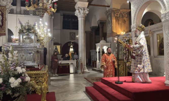 Ιερά Αγρυπνία το βράδυ της Κυριακής 22ας Οκτωβρίου 2023, στα πλαίσια των εορτών του Πολιούχου Αγίου Δημητρίου, τέλεσε ο Σεβασμιώτατος Μητροπολίτης Τρίκκης, Γαρδικίου και Πύλης κ. Χρυσόστομος στον Ιερό Προσκυνηματικό Ναό Αγίου Δημητρίου Θεσσαλονίκης.