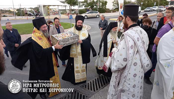 Σεβασμιώτατε, απόψε όδευσα εδώ με τους πολυτιμότερους συνεπιβάτες, εκείνους που αποτελούν τον όντως πλούτο της Εκκλησίας, εκείνους που αγκαλιάζουν σύνολη την ζωή της τοπικής μας Εκκλησίας, τους Αγίους Νεομάρτυρες του Ρεθύμνου που με τις Τίμιες Κάρες τους επισκέπτονται το πρώτον και με την Πρόνοια του Θεού την Ιερά Μητρόπολη Πέτρας και Χερρονήσου και τον Ιερό τούτο Βαπτιστηριακό Ναό, γράφοντας με αυτή τους την έξοδο μια ακόμη λαμπρή σελίδα στην ιστορία του.